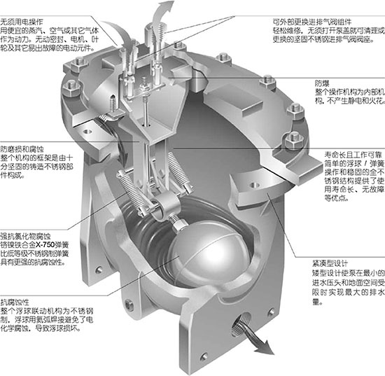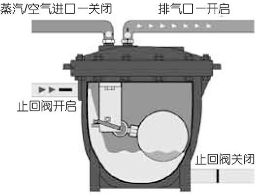 3.隨著凝結水的排出,浮球下降,直至聯動機構動作到低位,泵排氣口打開泵內壓力釋放,保留水封。