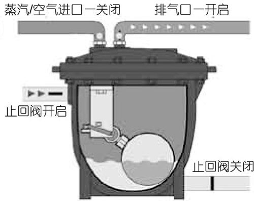 4.蒸汽空氣進口及泵出口止回閥重新關閉,排氣口和進口止回閥開啟,于是又進入充水狀態,重復動作過程。