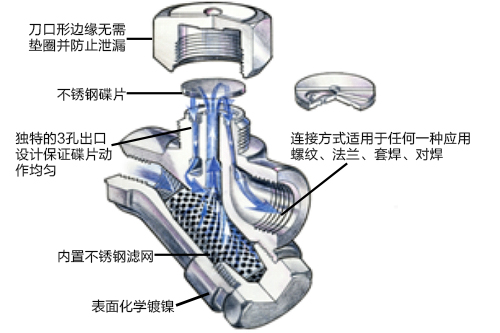 熱動力疏水閥獨特的三孔式凝結水出口保證了碟片動作的均勻動作,在各種條件下都能精密的關閉,以及流動特性的均勻性,從而延長了產品的使用壽命。